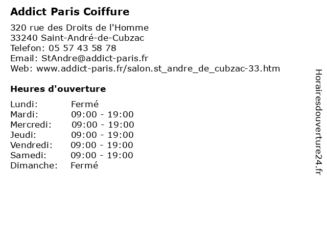 1 Addict Paris Coiffure (Distance: 13,41 km) 97 Avenue de l'aquitaine, 33560 Sainte Eulalie addict, beauté, coiffeur, coiffure, paris, salon 2 Coiffure Concept (Distance: 2,05 km) 180 Route de Libourne, 33240 Saint André de Cubzac coiffure, concept, coupe, esthétique, salon 3 Elias Coiffure (Distance: 10,53 km) 21 Rue du Président Coty, 33440 Ambarès et Lagrave coiffure, coupe, elias, esthétique, salon 4 Interview Coiffure (Distance: 12,66 km) - Avenue d’Aquitaine, 33560 Sainte Eulalie coiffure, interview, salon 5 Art et Coiffure (Distance: 14,30 km) 6 place pierre de brach, 33450 Montussan art, cheveux, coiffeur, coiffure, et 6 |