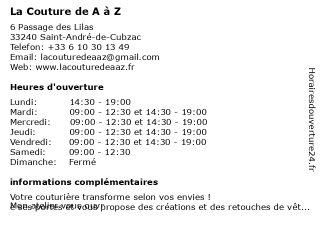 | Mardi | 09:00-12:30 et 14:30-19:00 |