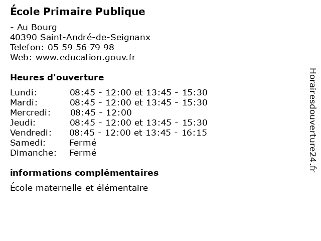 1 École Primaire Publique (Distance: 6,64 km) - Au Bourg, 40390 Saint-Martin-de-Hinx cours, education, primaire, publique, services, École, école 2 École Primaire Publique (Distance: 9,21 km) - Le Bourg, 40390 Sainte-Marie-de-Gosse cours, education, primaire, publique, services, École, école 3 École Primaire Publique (Distance: 10,54 km) - Rte du Cricq, 40230 Saint-Jean-de-Marsacq cours, education, primaire, publique, services, École, école 4 École primaire publique (Distance: 11,10 km) 181 Route de Capbreton, 40150 Angresse angresse, ecole, education, maternelle, primaire, publique, services, école 5 École Primaire Publique (Distance: 13,36 km) n/a Chemin de l'école, 64520 Guiche cours, education, primaire, publique, services, école 6 École Primaire Publique (Distance: 14,17 km) 28 Rte de Saint Vincent, 40230 Tosse cours, education, primaire, publique, services, École, école |