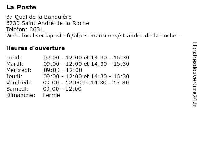 1 La Poste (Distance: 2,25 km) 1 Rue Joseph Gazan, 06000 Nice agence postale, courrier postal, expédition internationale, la, poste 2 La Poste (Distance: 3,10 km) 34 Avenue Jean Moulin, 06340 Drap agence postale, courrier postal, expédition internationale, la, poste 3 La Poste (Distance: 3,37 km) 9 Boulevard Saint-Roch, 06300 Nice agence, assurance, banque, banque postale, bureau de poste, chronopost, colis, courrier, dps, expéditions internationales, la, point, postale, poste, relais, timbres, téléphonie, ups, western union 4 La Poste (Distance: 3,82 km) 34 Rue Barberis, 06300 Nice agence, assurance, banque, banque postale, bureau de poste, chronopost, colis, courrier, dps, expéditions internationales, la, point, postale, poste, relais, timbres, téléphonie, ups, western union 6 La Poste (Distance: 7,22 km) - Place de la Mairie, 06670 Castagniers agence postale, courrier postal, expédition internationale, la, poste |