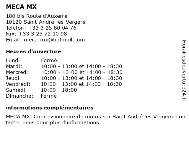| Mercredi | 10:00-13:00 et 14:00-18:30 |