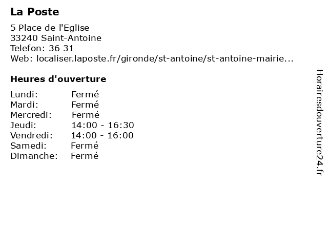 1 La Poste (Distance: 0,28 km) 10 Rue De La Commanderie, 32340 Saint Antoine colis, express chronopost, expédition, la, poste, réexpédition internationale, service, suivi du courrier 2 La Poste (Distance: 3,04 km) 14 Place Jean Jaurès, 33240 Peujard agence, assurance, banque, banque postale, bureau de poste, chronopost, colis, courrier, dps, expéditions internationales, la, point, postale, poste, relais, timbres, téléphonie, ups, western union 3 La Poste (Distance: 3,63 km) 94 avenue de la République, 33240 Salignac agence, assurance, banque, banque postale, bureau de poste, chronopost, colis, courrier, dps, expéditions internationales, la, point, postale, poste, relais, timbres, téléphonie, ups, western union 4 La Poste (Distance: 5,96 km) - Route d'Asques, 33240 Saint-Romain-la-Virvée agence, assurance, banque, banque postale, bureau de poste, chronopost, colis, courrier, dps, expéditions internationales, la, point, postale, poste, relais, timbres, téléphonie, ups, western union 5 La Poste (Distance: 6,69 km) 12 Place du Général de Gaulle, 33240 Cadillac-en-Fronsadais agence, assurance, banque, banque postale, bureau de poste, chronopost, colis, courrier, dps, expéditions internationales, la, point, postale, poste, relais, timbres, téléphonie, ups, western union 6 La Poste (Distance: 7,75 km) 13 Avenue des Anciens Combattans, 33230 Marasin agence, banque, bureau, la, poste |