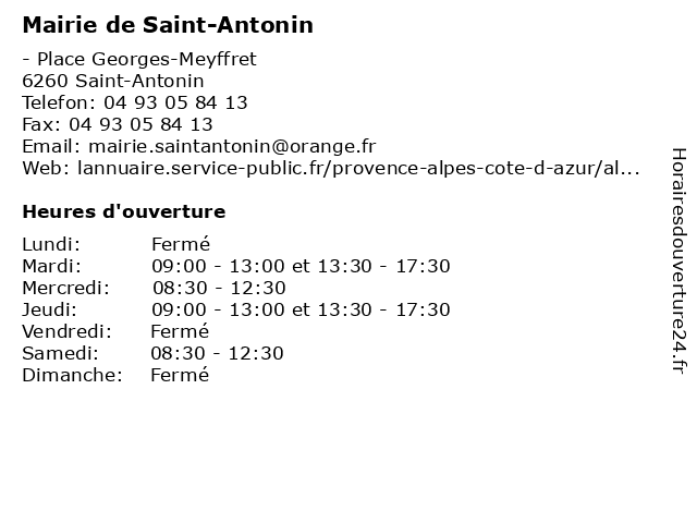 1 Mairie de Saint-Antonin (Distance: 4,44 km) . Place Georges, 06260 Saint-Antonin administration, antonin, assoc public, de, mairie, saint 2 Mairie de La Penne (Distance: 3,16 km) 1 place de l'Église, 06260 La Penne administration, de, la, mairie, penne, public, service 5 6 Mairie (Distance: 4,42 km) 1 rue du Pont-de-France, 06910 Roquesteron administration, mairie, public, service |
