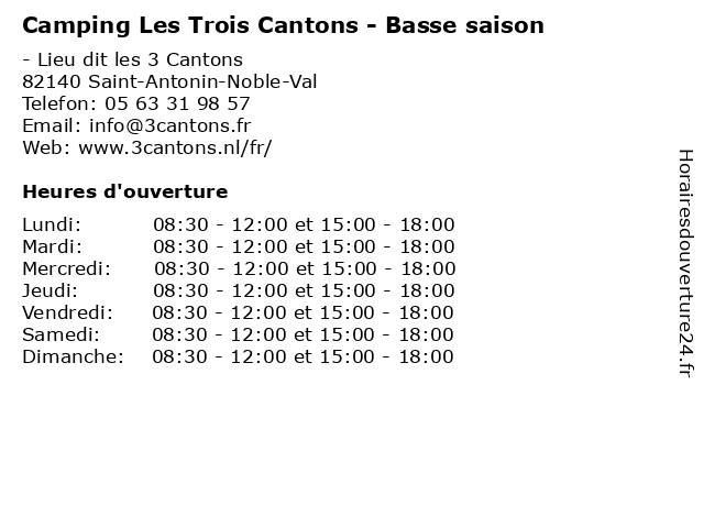 1 Camping Les Trois Cantons - Juillet et Août (Distance: 0,00 km) - Lieu dit les 3 Cantons, 82140 Saint-Antonin-Noble-Val août, camping, cantons, caravaning, et, juillet, les, loisirs, réception, tourisme, trois, vacances 2 Camping Les Trois Cantons - Hors saison (Distance: 0,00 km) - Lieu dit les 3 Cantons, 82140 Saint-Antonin-Noble-Val 15.04, 30.09, au, camping, cantons, caravaning, du, hors, les, loisirs, octobre, réception, saison, tourisme, trois, vacances 3 Camping Le Clos de la Lere - Réception - Mars à Octobre (Distance: 7,13 km) 230 route de Septfonds, 82240 Cayriech 1er, 2019, au, camping, clos, de, du, la, le, lere, loisirs, mars, novembre, octobre, réception, tourisme, vacances 4 Camping des Gorges de L'Aveyron - Réception basse saison (Distance: 7,65 km) - Marsac bas, 82140 Saint-Antonin-Noble-Val basse, camping, de, des, en, gorges, l'aveyron, loisirs, réception, saison, tourisme, vacances 5 Camping des Gorges de L'Aveyron - Réception juillet-août (Distance: 7,65 km) - Marsac bas, 82140 Saint-Antonin-Noble-Val août, camping, de, des, en, et, gorges, juillet, l'aveyron, loisirs, réception, tourisme, vacances 6 Camping La Bonnette (Distance: 7,77 km) 672 route de la Bonnette, 82160 Caylus bonnette, camping, caravaning, la, loisirs, tourisme, vacances |