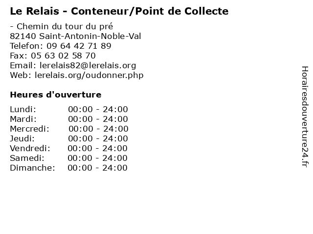 1 Le Relais - Conteneur/Point de Collecte (Distance: 0,44 km) - Place Du Pradel, 82140 Saint-Antonin-Noble-Val collecte, conteneur/point, de, dons, le, point, relais, vêtements 2 Le Relais - Conteneur/Point de Collecte (Distance: 1,00 km) - Route de Marsac, 82140 Saint-Antonin-Noble-Val collecte, conteneur/point, de, dons, le, point, relais, vêtements 3 Le Relais - Conteneur/Point de Collecte (Distance: 16,93 km) 38 Rue Lavoisier, 82300 Caussade collecte, conteneur/point, de, dons, le, point, relais, vêtements 4 Le Relais - Conteneur/Point de Collecte (Distance: 17,20 km) - Rue des frères Duclos, 82300 Caussade collecte, conteneur/point, de, dons, le, point, relais, vêtements 5 Le Relais - Conteneur/Point de Collecte (Distance: 17,51 km) 4 Rue de Versailles, 82300 Caussade collecte, conteneur/point, de, dons, le, point, relais, vêtements 6 Le Relais - Conteneur/Point de Collecte (Distance: 17,65 km) - Rue de la Solidarité, 82300 Caussade collecte, conteneur/point, de, dons, le, point, relais, vêtements |