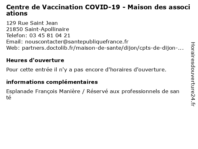 | 1 Centre de Vaccination COVID-19 - Stade Gaston Gérard (Distance: 1,12 km) 1 Rue du Stade, 21000 Dijon 19, centre, covid, covid 19, covid19, de, gaston, gérard, médecin, médecine, médical, stade, test, vaccin, vaccination, vaccins 2 CHU Nantes - Département d'Infectiologie / consultations de vaccination (Distance: 1,32 km) 14 Rue Paul Gaffarel, 21079 Dijon bureau, chu, consultation, consultations, d'infectiologie, de, dr, département, maladie, med, médecin, médecine, nantes, pratique, thérapie, traitement, vaccination 3 Centre de Vaccination COVID-19 - CHU (Distance: 1,41 km) 10 Boulevard Mal de Lattre de Tassigny, 21000 Dijon 19, centre, chu, covid, covid 19, covid19, de, médecin, médecine, médical, test, vaccin, vaccination, vaccins 4 Mission d'accueil et D'Information Des Associations (MAIA) (Distance: 2,06 km) 2 rue du Général Delaborde, 21000 Dijon administration, assoc, associations, d'accueil, d'information, des, et, maia, mission, services, services publics 5 Centre de Dépistage Covid-19 Dijon Clémenceau (Distance: 2,56 km) 8-12 Boulevard Georges Clemenceau, 21000 Dijon 19, centre, centre covid, centre de dépistage, clémenceau, coronavirus, covid, covid19, de, dijon, dépistage, laboratoire, laboratoire d analyse médicale, résultats, sérologie, test covid, test pcr 6 Greffe des associations - Côte-d'Or (Distance: 3,04 km) 6 rue Chancelier-de-l'Hospital, 21000 Dijon administration, assoc, associations, côte, d'or, des, greffe, locale, mission, services, services publics |