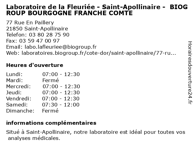 Termes de recherche pour Laboratoire de la Fleuriée - Saint-Apollinaire - BIOGROUP BOURGOGNE FRANCHE COMTE:la, de, saint, comte, apollinaire, laboratoire, bourgogne, franche, fleuriée, biogroup, dépistages, laboratoire de diagnostic |
