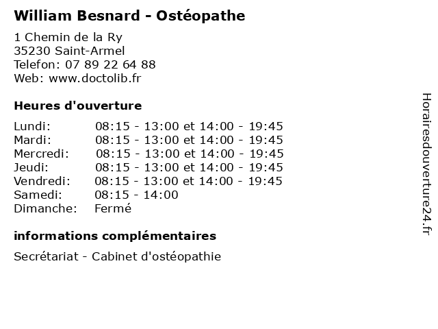 | Lundi | 08:15-13:00 et 14:00-19:45 |
