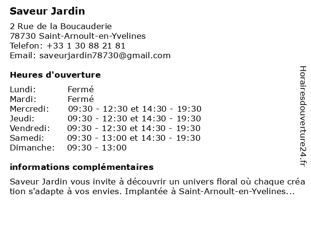 1 Saveur Jardin (Distance: 7,40 km) 8 Rue Saint-Pierre, 91410 Dourdan bouquets, composition, fleuriste, fleurs, jardin, plantes, saveur 3 Pâtisserie Le Jardin Sucré (Distance: 11,91 km) 10 Place Paul Grimault, 78720 Cernay-la-Ville boutique, créations, jardin, le, pâtisserie, sucré 4 Le Jardin d Italie (Distance: 17,42 km) 2 Rue Du Pavé, 91650 Breuillet collations, italie, jardin, le, restaurants 5 Aux Delices Du Jardin (Distance: 17,97 km) 3 Place De l Eglise, 91650 Breux Jouy aux, delices, jardin, restaurants 6 |