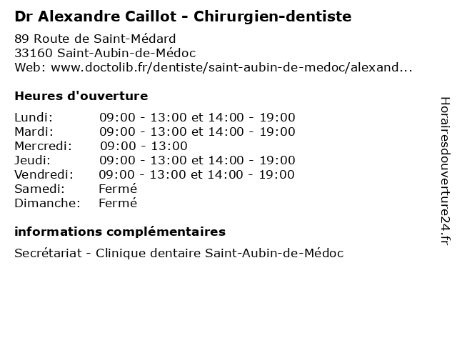 1 Clinique Dentaire Dr Caillot et Dr De Ryck (Distance: 0,01 km) 89 Route de Saint-Médard, 33160 Saint-Aubin-de-Médoc caillot, clinique, de, dentaire, dr, et, ryck 2 Caillot Charly (Distance: 7,46 km) 28 Allee Des Maraichers, 33700 Merignac caillot, charly, restaurants 3 Alexandre Brossard - Ostéopathe - secrétariat (Distance: 11,70 km) 152 Avenue du Maréchal Gallieni, 33700 Mérignac alexandre, brossard, care, health, ostéopathe, secrétariat, service 4 Dr Alexandre Jacquin - Chirurgien viscéral et digestif - secrétariat (Distance: 12,27 km) 22 Rue Henri Guillemin, 33300 Bordeaux alexandre, chirurgien, consultation, digestif, docteur, dr, et, jacquin, med, médecin, médecine, secrétariat, traitement, viscéral 5 Alexandre Turpault (Distance: 13,40 km) . Place des Grands Hommes, 33000 Bordeaux alexandre, centre, commercial, grands, hommes, les, turpault 6 Caillot Frederic (Distance: 13,52 km) 5 Place Saint Martial, 33300 Bordeaux caillot, frederic, restaurants |