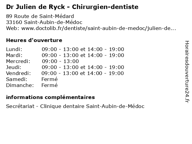 1 Clinique Dentaire Dr Caillot et Dr De Ryck (Distance: 0,01 km) 89 Route de Saint-Médard, 33160 Saint-Aubin-de-Médoc caillot, clinique, de, dentaire, dr, et, ryck 2 Julien Ruperd Pédicure-podologue - secretariat (Distance: 0,60 km) 53 Route de Saint-Médard,, 33160 Saint-Aubin-de-Médoc julien, médecin, médecine, médical, pharmaceutique, podologue, pédicure, ruperd, secretariat, traitement 3 Dr Julien Giraud - Médecin généraliste (Distance: 1,10 km) 30 Rue François Mitterand, 33160 Saint-Médard-en-Jalles docteur, dr, generaliste, giraud, généraliste, julien, medical, médecin, soin 4 Mirande Julien (Distance: 1,36 km) 3 Rue Francois Coppee, 33160 Saint Medard En Jalles boucheries, julien, mirande, poissonneries 5 Julien Loubrie - Ostéopathe (Distance: 2,83 km) 1a Chemin Lafon, 33160 Saint-Médard-en-Jalles julien, loubrie, ostéo, ostéopathe, ostéopathes, soins 6 |