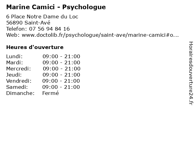 1 Institut Marine Océane (Distance: 0,62 km) 3 rue Pierre le Nouail, 56890 Saint-Avé beauté, institut, manucure, marine, massage, océane, soins, épilation 2 Marine Impact (Distance: 2,56 km) 25 rue Alain Gerbaut, 56000 Vannes accastillage, accessoires, bateaux, impact, magasin, marine, matériel, remorques 3 Marine Lamour - Sage-femme (Distance: 2,96 km) 20 Boulevard Général Maurice Guillaudot, 56000 Vannes consultation, docteur, femme, lamour, marine, med, medecine, medical, médecin, sage, traitement 4 Dr Marine Le Gall - Médecin généraliste (Distance: 2,96 km) 20 Boulevard Général Maurice Guillaudot, 56000 Vannes consultation, docteur, dr, gall, généraliste, le, marine, med, medecine, medical, médecin, traitement 5 Maître Marine Brimboeuf - Avocate (Distance: 3,94 km) 14 Boulevard de la Paix, 56000 Vannes avocate, avocats, brimboeuf, civils, droits, juridiques, marine, maître 6 Marine Nai-Im - Ostéopathe (Distance: 4,14 km) 10 Rue Madame de Ségur, 56000 Vannes im, marine, nai, ostéo, ostéopathe, ostéopathes, soins |