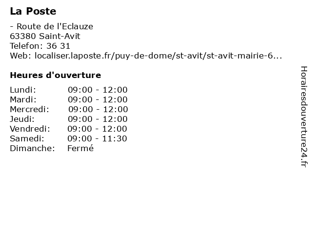 1 La Poste (Distance: 1,07 km) Le Bourg, 63380 Saint-Avit agence, assurance, banque, banque postale, bureau de poste, chronopost, colis, courrier, dps, expéditions internationales, la, point, postale, poste, relais, timbres, téléphonie, ups, western union 2 La Poste (Distance: 8,03 km) 17 Place de l'Eglise, 63380 Montel-de-Gelat agence, assurance, banque, banque postale, bureau de poste, chronopost, colis, courrier, dps, expéditions internationales, la, point, postale, poste, relais, timbres, téléphonie, ups, western union 3 La Poste (Distance: 10,77 km) - Le Bourg, 63380 Montel de Gelat colis, express chronopost, expédition, la, poste, réexpédition internationale, service, suivi du courrier 4 La Poste (Distance: 11,84 km) 16 Route D Aubusson, 23260 La Villetelle express chronopost, la, poste, réexpédition internationale 5 La Poste (Distance: 12,47 km) - Le Bourg, 23190 Mautes agence, assurance, banque, banque postale, bureau de poste, chronopost, colis, courrier, dps, expéditions internationales, la, point, postale, poste, relais, timbres, téléphonie, ups, western union 6 La Poste (Distance: 14,60 km) - Grande Rue, 63470 Herment agence, assurance, banque, banque postale, bureau de poste, chronopost, colis, courrier, dps, expéditions internationales, la, point, postale, poste, relais, timbres, téléphonie, ups, western union |