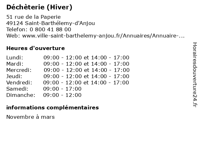 1 Déchèterie (Hiver) (Distance: 4,81 km) - Allée Seuil en Maine, 49000 Angers bennes, collecte, débarras, déchets, déchèterie, détritus, hiver, tri 2 Déchèterie (Hiver) (Distance: 6,96 km) - lieu-dit Le Petit Guichard, 49480 Saint-Sylvain-d'Anjou 1/11, 31/03, au, du, déchèterie, gravats, hiver, huiles usées, la réception des déchets et écocentres, les appareils électroménagers, les déchets verts, papier et carton en quantité 3 Déchèterie (Hiver) (Distance: 7,56 km) - Rue de la Ternière, 49240 Avrillé bennes, collecte, débarras, déchets, déchèterie, détritus, hiver, tri 4 Déchèterie (Hiver) (Distance: 11,53 km) - ZI du Haut-Coudray, 49460 Montreuil-Juigné bennes, collecte, débarras, déchets, déchèterie, détritus, hiver, tri 5 Déchèterie (Hiver) (Distance: 15,27 km) - route départementale 311, 49170 La Possonnière bennes, collecte, débarras, déchets, déchèterie, détritus, hiver, tri 6 Déchèterie (Hiver) (Distance: 17,66 km) - Chemin des Cuetteries, 49125 Tiercé bennes, collecte, débarras, déchets, déchèterie, détritus, hiver, tri |