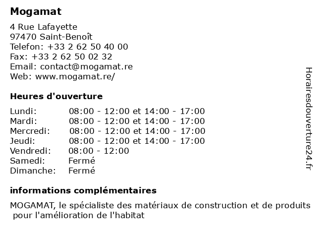 | Lundi | 08:00-12:00 et 14:00-17:00 |