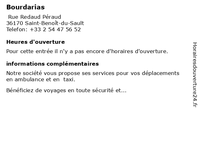 1 Ambulance Bourdarias (Distance: 7,30 km) 10 Rue de la Fontaine Poulard, 36310 Chaillac ambulance, bourdarias |