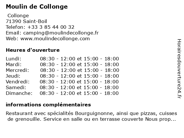 | Mercredi | 08:30-12:00 et 15:00-18:00 |