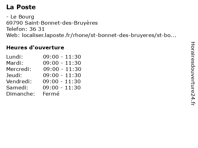 1 La Poste (Distance: 2,81 km) - Le Bourg, 69790 Aigueperse colis, express chronopost, expédition, la, poste, réexpédition internationale, service, suivi du courrier 2 La Poste (Distance: 4,17 km) - Lotissement du Bourg, 71520 Matour agence, assurance, banque, banque postale, bureau de poste, chronopost, colis, courrier, dps, expéditions internationales, la, point, postale, poste, relais, timbres, téléphonie, ups, western union 3 La Poste (Distance: 4,19 km) - Rue Saint-Pierre, 71520 Saint-Pierre-le-Vieux agence, colis, courriers, expédition, la, postale, poste, relais 4 La Poste (Distance: 5,40 km) Le Bourg, 71520 Saint-Pierre-le-Vieux agence, assurance, banque, banque postale, bureau de poste, chronopost, colis, courrier, dps, expéditions internationales, la, point, postale, poste, relais, timbres, téléphonie, ups, western union 6 La Poste (Distance: 12,62 km) 2 Rue de la Poste, 71800 La Clayette express chronopost, la, poste, réexpédition internationale |