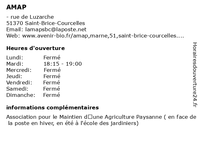 1 AMAP (Distance: 19,35 km) - place du Marché, 02190 Guignicourt alimentation, amap, fruits, légumes, primeurs, producteur 2 AMAP Champagne-Ardenne (Distance: 2,68 km) 23 Rue Alphonse Daudet, 51100 Reims alimentation, amap, ardenne, champagne, fruits, légumes, primeurs, producteur, viandes 3 AMAP Champagne-Ardenne (Distance: 3,82 km) 16 Rue du Barbâtre, 51100 Reims alimentation, amap, ardenne, champagne, fruits, légumes, primeurs, producteur, viandes 4 AMAP Champagne-Ardenne (Distance: 9,32 km) 9 avenue des Nelmonts, 51420 Witry-lès-Reims alimentation, amap, ardenne, champagne, fruits, légumes, primeurs, producteur, viandes 5 AMAP de la Tonnellerie (Distance: 9,54 km) 2 place Barré, 51100 Reims alimentation, amap, de, fruits, la, légumes, primeurs, producteur, tonnellerie, viandes 6 AMAP La Gousse d'Ay (Distance: 19,70 km) - rue Pasteur, 51160 Aÿ-Champagne alimentation, amap, d'ay, fruits, gousse, la, légumes, primeurs, producteur, viandes |