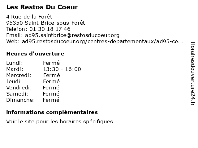 1 Les Restos Du Coeur (Distance: 4,16 km) 4 Avenue Paul Valéry, 95200 Sarcelles aides, alimentaire, coeur, du, les, restos, santé, solidarité, soutien 2 Les Restos Du Coeur (Distance: 4,34 km) 2 Avenue du Général Leclerc, 95230 Soisy-sous-Montmorency aides, alimentaire, coeur, du, les, restos, santé, solidarité, soutien 3 Les Restos Du Coeur (Distance: 4,38 km) 85 Rue Maurice Grandcoing, 93430 Villetaneuse aides, alimentaire, coeur, du, les, restos, santé, solidarité, soutien 4 Les Restos Du Coeur (Distance: 5,48 km) 1 Rue Edouard le Corbusier, 95140 Garges-lès-Gonesse aides, alimentaire, coeur, du, les, restos, santé, solidarité, soutien 5 Les Restos Du Coeur (Distance: 6,00 km) 1 rue de l'Abbé Pierre, 93800 Epinay-sur-Seine aide, coeur, dons, du, les, resto, restos, solidarité, vente 6 Les Restos Du Coeur (Distance: 6,89 km) 7 Rue Jacques Duclos, 93200 Saint-Denis aide, coeur, dons, du, les, resto, restos, solidarité, vente |