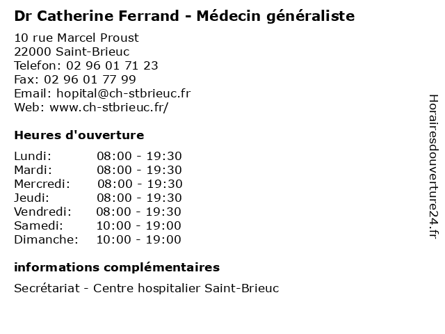 1 Dr Catherine Allaire - Neurologue (Distance: 0,00 km) 10 rue Marcel Proust, 22000 Saint-Brieuc allaire, catherine, consultation, docteur, dr, med, médecin, médecine, neurologue, traitement 2 Dr. Catherine Guezennec - Médecin nucléaire (Distance: 0,00 km) 10 rue Marcel Proust, 22000 Saint-Brieuc catherine, consultation, docteur, dr., guezennec, med, médecin, médecine, nucléaire, traitement 3 Foertsch Catherine (Distance: 2,83 km) Rattachement Mairie, 22000 Saint Brieuc catherine, foertsch, restaurants 4 Catherine Ducassoux (Distance: 2,86 km) 3 Rue Saint-Vincent de Paul, 22000 Saint-Brieuc catherine, ducassoux 6 |