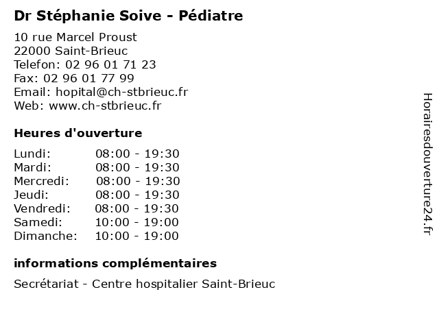 1 Dr Stéphanie Malexieux - Pédiatre (Distance: 0,00 km) 10 rue Marcel Proust, 22000 Saint-Brieuc consultation, docteur, dr, malexieux, med, médecin, médecine, pédiatre, stephanie, stéphanie, traitement 2 Dr Stéphanie Couvreur - Gynécologue obstétricien (Distance: 0,00 km) 10 rue Marcel Proust, 22000 Saint-Brieuc consultation, couvreur, docteur, dr, gynécologue, med, médecin, médecine, obstétricien, stephanie, stéphanie, traitement 3 Stéphanie Hourdel - Sage-femme (Distance: 0,00 km) 10 rue Marcel Proust, 22000 Saint-Brieuc consultation, docteur, femme, hourdel, med, médecin, médecine, sage, stephanie, stéphanie, traitement 4 Dr Hélène Hamon - Pédiatre - secrétariat (Distance: 2,10 km) 3 Boulevard Waldeck Rousseau, 22000 Saint-Brieuc consultation, docteur, dr, hamon, hélène, med, médecin, médecine, pédiatre, secrétariat, traitement 6 Stéphanie Gringoire - Psychologue (Distance: 2,34 km) 11 Place de l'Église, 22360 Langueux gringoire, psy, psychiatre, psychologue, sante, soins, stéphanie |