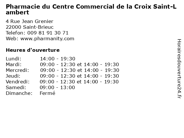 | Mercredi | 09:00-12:30 et 14:00-19:30 |