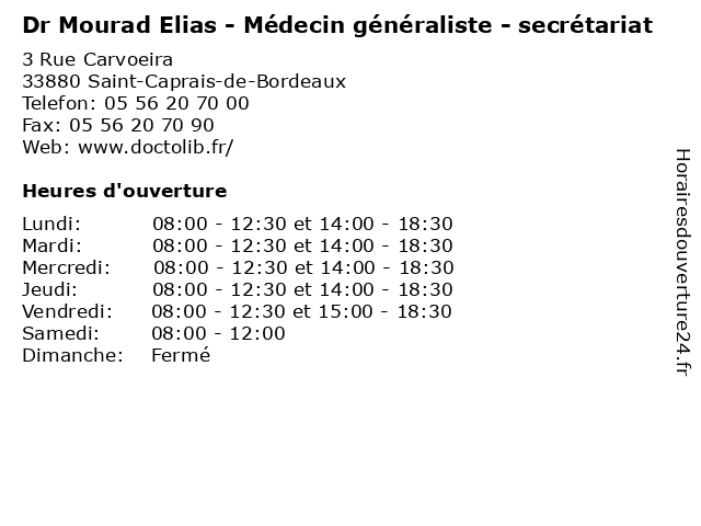 | Lundi | 08:00-12:30 et 14:00-18:30 |