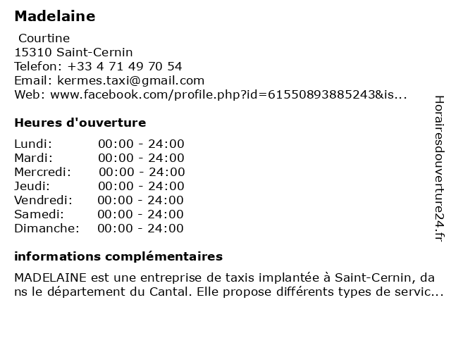 MADELAINE est une entreprise de taxis implantée à Saint-Cernin, dans le département du Cantal. Elle propose différents types de services pour répondre à tous les besoins de ses clients et s'a...