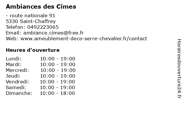 | Samedi | 10:00-19:00 |