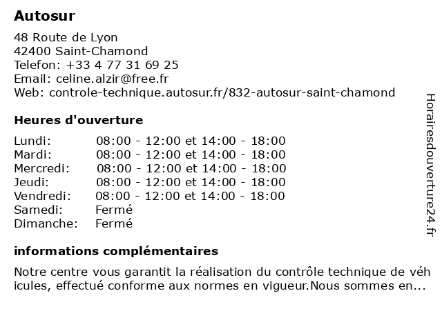 2 Autosur (Distance: 17,64 km) n/a Route Nationale 7, 38550 Auberives Sur Vareze auto repair, automotive, autosur, specific, utility 3 AUTOSUR SAINT-CHAMOND (Distance: 0,00 km) 48 B Route de Lyon, 42400 Saint-Chamond autosur, chamond, saint 4 AUTOSUR GRAND-CROIX (Distance: 3,71 km) 6bis Rue Louis Pasteur, 42320 La Grand-Croix autosur, croix, grand 6 AUTOSUR SAINT-ÉTIENNE MONTREYNAUD (Distance: 9,98 km) 8 Rue Gustave Delory, 42000 Saint-Étienne autosur, montreynaud, saint, étienne |