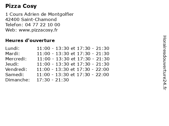 1 Pizza Cosy (Distance: 5,27 km) 3 Rue du Moulin Gilliers, 42290 Sorbiers boissons, cosy, desserts, pizza, pizzeria, restaurant, salades 2 Pizza Cosy (Distance: 7,04 km) - Esplanade Paul et Guy Vantajol, 42100 Saint-Étienne boissons, cosy, desserts, pizza, pizzeria, restaurant, salades 3 Pizza Cosy (Distance: 9,29 km) 53 Rue Edouard Vaillant, 42800 Rive-de-Gier boissons, cosy, desserts, pizza, pizzeria, restaurant, salades 4 Pizza Cosy (Distance: 10,44 km) 1 Avenue Albert Raimond, 42270 Saint-Priest-en-Jarez boissons, cosy, desserts, pizza, pizzeria, restaurant, salades 6 Pizza Cosy (Distance: 15,37 km) 1 Impasse Louis Comté, 42230 Roche-La-Molière cosy, pizza, pizzeria, restaurants, restauration |