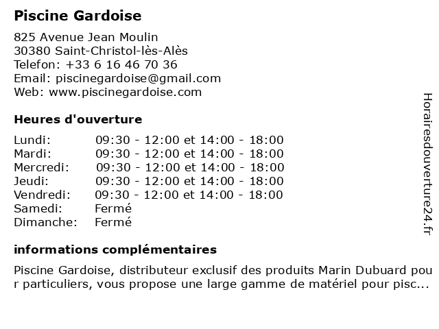 | Mercredi | 09:30-12:00 et 14:00-18:00 |