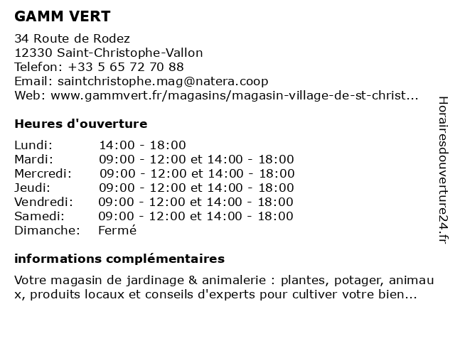 1 GAMM VERT (Distance: 11,09 km) 878 Avenue de Rodez, 12390 Rignac animalerie, animaux, gamm, jardinage, plantes, potager, produits locaux, vert 3 Gamm Vert (Distance: 14,37 km) n/a Route de Villecomtal, 65190 Bordes automobile, centre auto, dépannage, entretien, gamm, garage, nettoyage, pièces techniques, pneus, réparation, transport, tuning et accessoires, vert, équipement intérieur / extérieur auto 6 GAMM VERT (Distance: 17,32 km) Route D Espalion, 12850 Onet-le-Château animalerie, animaux, gamm, jardinage, plantes, potager, produits locaux, vert |