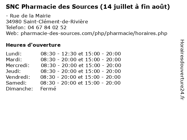 1 SNC Pharmacie des Sources (Horaires de garde de la pharmacie) (Distance: 0,00 km) - Rue de la Mairie, 34980 Saint-Clément-de-Rivière de, des, garde, horaires, la, médecine, médicament, pharmacie, santé, snc, sources 2 Pharmacie Des Sources (Distance: 0,28 km) Avenue de la Clastre, 34980 Saint-Clément-de-Rivière des, pharmacie, sources 3 Domaine de L'Oulivie - Juillet à Août (Distance: 4,46 km) - Mas de fourques, 34980 Combaillaux août, bio, de, domaine, gîtes, huile d'olive, juillet, l'oulivie, oulivie, ouverture 4 Bibliothèque Municipale de Jacou (d’été juillet- août ) (Distance: 6,01 km) . Avenue de Vendargues, 34830 Vendargues août, bibliothèque, de, d’été, jacou, juillet, livre, municipale, médiathèque, services 5 Vignobles Rambier - Juillet et août (Distance: 7,69 km) - Pic Saint-Loup, 34270 Saint-Jean de Cuculles août, domaine, du, et, haut, juillet, lirou, raisin, rambier, vente, vignobles, vin, viticole 6 |