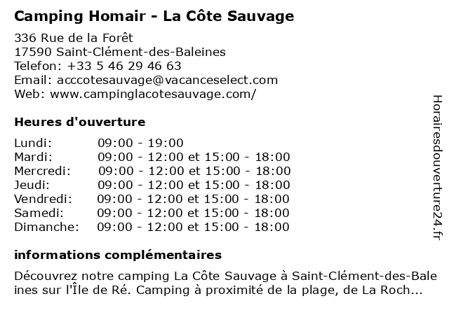 1 Camping Côte Sauvage - Tohapi (Réception, haute saison) (Distance: 0,06 km) 336 rue de la forêt, 17590 St Clément Des Baleines camping, côte, haute, hebergement, réception, saison, sauvage, tohapi, tourisme 2 Camping Côte Sauvage - Tohapi (Réception, basse saison) (Distance: 0,06 km) 336 rue de la forêt, 17590 St Clément Des Baleines basse, camping, côte, hebergement, réception, saison, sauvage, tohapi, tourisme 3 Korian Côte Sauvage (Distance: 2,62 km) 21 Avenue d'Antioche, 17590 Ars-en-Ré alzheimer, côte, korian, sauvage, services, soins 4 Restaurant Aux Frères De La Côte (Distance: 2,94 km) 5793 Route de la Grange, 17590 Ars en Ré aux, côte, de, frères, la, restaurant, ré 5 Spa Côte & Zen (Distance: 15,50 km) 6 Rue des Halles, 85360 La Tranche-sur-Mer bien-etre, côte, massages, relax, sante, spa, zen 6 Camping Homair - La Grainetière (Distance: 15,99 km) Chemin des Essarts, 17630 La Flotte camping, camping 5 étoiles, camping 5 étoiles ile de ré, camping avec club enfants, camping avec parc aquatique ile de ré, camping avec piscine, camping bord de mer ile de ré, camping charente maritime, camping en bord de mer, camping flotte en ré, camping ile de ré, camping la grainetière, camping parc aquatique, camping sur l ile de ré, grainetière, homair, la |