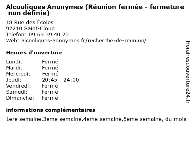 Termes de recherche pour Alcooliques Anonymes (Réunion fermée - fermeture non définie):reunion, non, fermeture, alcooliques, anonymes, définie, fermée |