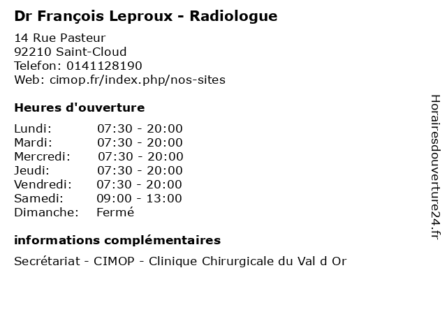 1 Dr François Leproux - Radiologue (Distance: 2,41 km) 141 Grande Rue, 92310 Sèvres consultation, docteur, dr, francois, françois, leproux, med, médecin, médecine, radiologue, traitement 2 Dr Jean-François Ripoll - Stomatologue (Distance: 0,97 km) - Rue Charles Lauer, 92210 Saint Cloud consultation, docteur, dr, françois, jean, med, médecin, médecine, ripoll, stomatologue, traitement 3 Dr François Drupt - Médecin biologiste (Distance: 0,97 km) 35 rue Dailly, 92210 Saint Cloud biologiste, consultation, docteur, dr, drupt, francois, françois, med, médecin, traitement 4 Dr Anaïs François - Médecin généraliste (Distance: 2,56 km) 104 boulevard Raymond Poincaré, 92380 Garches anais, anaïs, consultation, docteur, dr, francois, françois, généraliste, med, médecin, médecine, traitement 5 Dr François Genet - Spécialiste en médecine physique et de réadaptation (Distance: 2,56 km) 104 boulevard Raymond Poincaré, 92380 Garches consultation, de, docteur, dr, en, et, francois, françois, genet, med, médecin, médecine, physique, réadaptation, spécialiste, traitement 6 Dr François Bouquet - Chirurgien-dentiste (Distance: 3,80 km) 105 Boulevard Murat, 75016 Paris bouquet, chirurgien, dentaire, dentiste, dr, françois, implantologie, parodontologie |