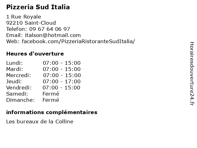 1 Restaurant Angelo Pizzeria (Distance: 0,10 km) 2 Rue de l'Église, 92210 Saint-Cloud angelo, italien, pizza, pizzas, pizzeria, restaurant, restauration 2 Greta 92 - Sud (Distance: 1,18 km) 54 Rue De Billancourt, 92100 Boulogne-Billancourt 92, administration, assoc, greta, services, services publics, sud 3 Pizzeria Baccano (Distance: 1,35 km) 25 Boulevard Jean Jaurès, 92100 Boulogne-Billancourt baccano, italien, pizza, pizzas, pizzeria, restaurant, restauration 4 Sud Express (Distance: 1,49 km) 71 Boulevard Jean Jaurès, 92100 Boulogne-Billancourt accessoires, chaussures, express, habillement, mode, pret-a-porter, sud, vetements 5 Auteuil Sud Immobilier (Distance: 3,09 km) 96 rue Chardon Lagache, 75016 Paris achat, agence, agent, appartement, auteuil, bailleur, gestion, immobilier, immobilière, location, logement, maisons, sud, transactions, vente 6 ORIENTACTION Paris 16eme "Sud" - Bilan de compétences (Distance: 3,29 km) 31 Rue Chardon Lagache, 75016 Paris "sud", 16eme, bilan, compétences, de, orientaction, paris |