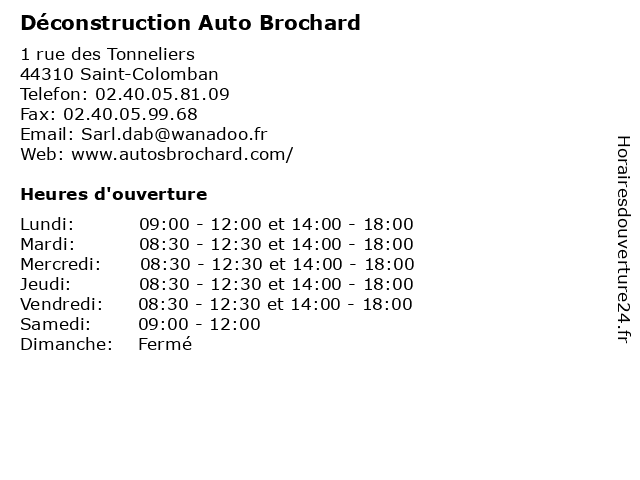 1 DECONSTRUCTION AUTO BROCHARD (Distance: 2,02 km) Zone d'activité Pont James, 44310 Saint-Colomban auto, brochard, deconstruction 4 Sas Brochard (Distance: 19,08 km) 7 Rue Des Jardins, 85600 Saint Hilaire De Loulay brochard, restaurants 5 Charier (Distance: 17,29 km) 13 Rue de l'Aéronautique, 44340 Bouguenais carrieres, charier, déconstruction, désamiantage, materiaux, recyclage, terrassement 6 |