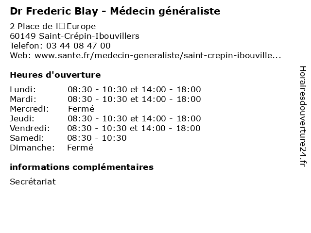 | Vendredi | 08:30-10:30 et 14:00-18:00 |