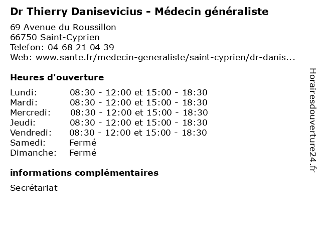 1 Dr Thierry Danisevicius - Médecin généraliste (Distance: 0,00 km) 69 Avenue du Roussillon, 66750 Saint-Cyprien consultation, danisevicius, docteur, dr, générale, généraliste, medecins, médecin, médecine, rendez, santé, sur, thierry, vous 2 Dr Thierry Danisevicius - Médecin généraliste (Distance: 0,00 km) 69 Avenue du Roussillon, 66750 Saint-Cyprien consultation, danisevicius, docteur, domicile, dr, en, générale, généraliste, medecins, médecin, médecine, santé, thierry, visite 3 Medecin Thierry Maurin (Cardiologue) (Distance: 7,00 km) 26 Chemin de Palau, 66700 Argeles-sur-Mer cardiologue, docteur, maurin, medecin, sante, services, thierry 4 Medecin Thierry Lenel (Cardiologue) (Distance: 10,17 km) 3 Avenue Arnaud de Villeneuve, 66330 Cabestany cardiologue, docteur, lenel, medecin, sante, services, thierry 5 Monsieur Thierry Faure La Bodega Des Sources (Distance: 10,64 km) 6 Rue Du Centre, 66690 Sorede bodega, faure, restaurants, sources, thierry 6 Monsieur Thierry Scolari (Distance: 12,90 km) 11 Avenue De Belfort, 66000 Perpignan restaurants, scolari, thierry |