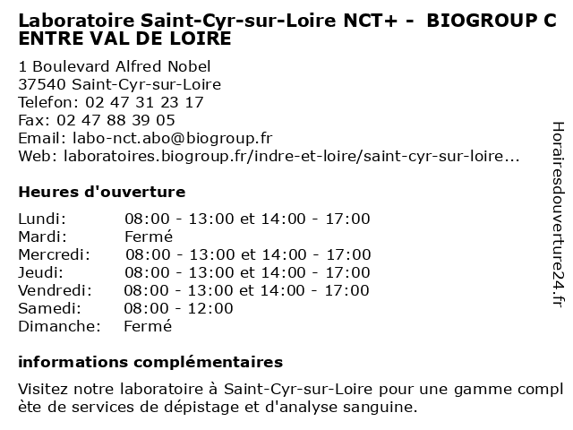 Termes de recherche pour Laboratoire Saint-Cyr-sur-Loire NCT+ - BIOGROUP CENTRE VAL DE LOIRE:val, sur, de, saint, loire, cyr, laboratoire, centre, biogroup, dépistages, laboratoire de diagnostic, nct+ |