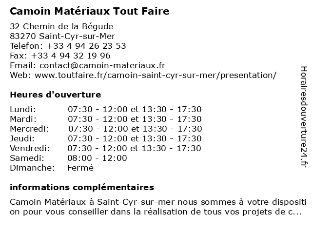 | Lundi | 07:30-12:00 et 13:30-17:30 |