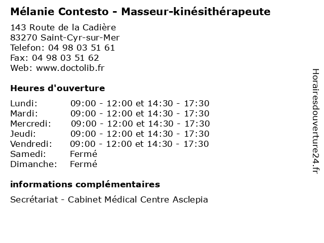 1 Mélanie Contesto - Masseur-kinésithérapeute (Distance: 1,06 km) 210 Allée des Poivriers, 83270 Saint-Cyr-sur-Mer consultation, contesto, docteur, kinésithérapeute, masseur, med, médecin, mélanie, traitement 3 Mélanie Perez - Psychologue (Distance: 12,96 km) 130 Avenue de la Calade, 83140 Six-Fours-les-Plages mélanie, perez, psy, psychiatre, psychologue, sante, soins 4 Mélanie Claverie - Diététicienne (Distance: 13,13 km) - ZAE les Barles, 13470 Carnoux-en-Provence aliment, claverie, dieticien, diététicien, diététicienne, medecin, mélanie, nutrition 5 Dr Mélanie Chastel - Médecin généraliste (Distance: 16,55 km) 105 Avenue Marcel Paul, 13400 Aubagne chastel, consultation, docteur, dr, généraliste, med, medecine, medical, médecin, mélanie, traitement 6 Studio Ballet Mélanie HREN (Distance: 18,50 km) 206 rue Henri Vienne, 83000 Toulon académie, ballet, dance, hren, mélanie, studio, style |
