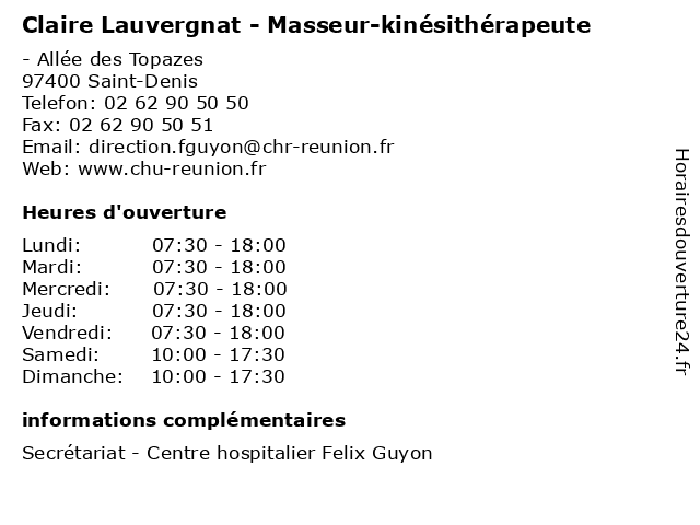 1 Dr Claire Brayer - Pédiatre (Distance: 0,00 km) - Allée des Topazes, 97400 Saint-Denis brayer, claire, consultation, docteur, dr, med, médecin, pédiatre, traitement 2 Centre de Santé Vision Claire (Distance: 3,47 km) 216 Boulevard Jean Jaurès, 97490 Sainte-Clotilde centre, claire, de, ophtalmologie, ophtalmologique, santé, vision 3 Dr Claire Slaoui - Médecin généraliste (Distance: 3,86 km) - Route des Ananas, 97490 Saint-Denis claire, consultation, docteur, dr, généraliste, med, médecin, slaoui, traitement 4 La Vie Claire (Distance: 5,19 km) 20 Rue Gabriel de Kerveguen, 97490 Sainte Clotilde boissons, claire, cosmétiques, huiles essentielles, la, pains, produits d’épicerie, produits frais, produits ménager, sans gluten, vie 5 La Vie Claire (Distance: 18,52 km) 4 allée des Palmistes Savannah, 97460 Saint Paul de La Réunion claire, conseils bio, la, la volaille bio, le citron, le vin bio, les flocons d'avoine, recettes bio, vie 6 Tiphaine Delbecq - Masseur-kinésithérapeute (Distance: 0,00 km) - Allée des Topazes, 97400 Saint-Denis consultation, delbecq, docteur, dr, kinésithérapeute, masseur, med, médecin, tiphaine, traitement |