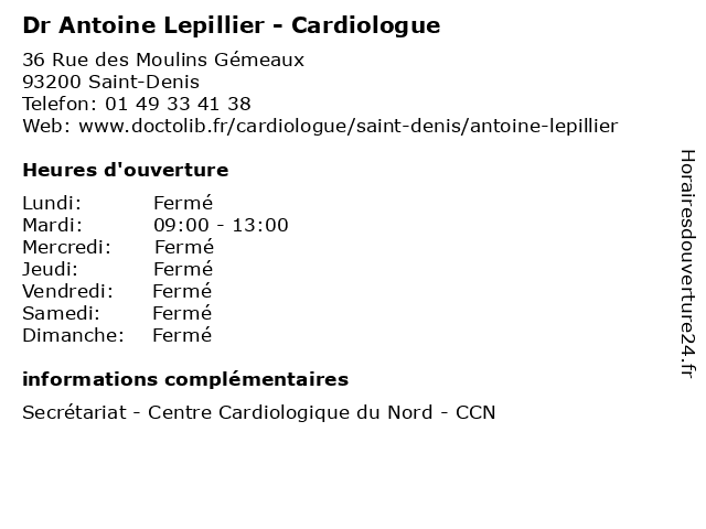 1 Dr Marc Benacerraf - Cardiologue (Distance: 0,00 km) 36 Rue des Moulins Gémeaux, 93200 Saint-Denis benacerraf, cardiologue, consultation, docteur, dr, marc, med, médecin, médecine, secrétariat, traitement 2 Dr Elisabeth Riant - Cardiologue (Distance: 0,00 km) 36 Rue des Moulins Gémeaux, 93200 Saint-Denis cardio, cardiologie, cardiologue, coeur, dr, elisabeth, riant 3 Dr Christophe Benvenuti - Cardiologue (Distance: 0,00 km) 36 Rue des Moulins Gémeaux, 93200 Saint-Denis benvenuti, cardio, cardiologie, cardiologue, christophe, coeur, dr 4 Dr Philippe Veau - Cardiologue (Distance: 0,00 km) 36 Rue des Moulins Gémeaux, 93200 Saint-Denis cardiologue, consultation, docteur, dr, med, médecin, médecine, philippe, secrétariat, traitement, veau 5 Dr Aliocha Scheuble - Cardiologue (Distance: 0,00 km) 36 Rue des Moulins Gémeaux, 93200 Saint-Denis aliocha, cardiologue, consultation, docteur, dr, med, médecin, médecine, scheuble, secrétariat, traitement 6 Dr Juliette Rousseau - Cardiologue (Distance: 0,00 km) 36 Rue des Moulins Gémeaux, 93200 Saint-Denis cardiologue, consultation, docteur, dr, juliette, med, médecin, médecine, rousseau, secrétariat, traitement |