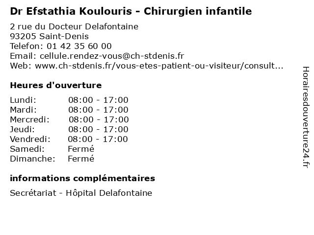 1 Dr Ghania Gouizi - Chirurgien infantile (Distance: 0,00 km) 2 rue du Docteur Delafontaine, 93205 Saint-Denis chirurgien, consultation, docteur, dr, ghania, gouizi, infantile, med, médecin, médecine, traitement 2 Centre Hospitalier Saint-Denis - Chirurgie Infantile Viscérale (Distance: 0,00 km) 2 Rue du Dr Delafontaine, 93200 Saint-Denis bureau, centre, chirurgie, consultation, denis, dr, hospitalier, infantile, maladie, med, médecin, médecine, pratique, saint, thérapie, traitement, viscérale 3 Centre Hospitalier Saint-Denis - Chirurgie Infantile Orthopédie (Distance: 0,00 km) 2 Rue du Dr Delafontaine, 93200 Saint-Denis bureau, centre, chirurgie, consultation, denis, dr, hospitalier, infantile, maladie, med, médecin, médecine, orthopédie, pratique, saint, thérapie, traitement 4 Centre de Protection Maternelle et Infantile (Distance: 5,37 km) 26 rue de La Ferme, 93000 Bobigny centre, centre de protection maternelle, de, et, gynécologie, infantile, maternelle, planification familiale, protection, pédiatrie 5 Centre de Protection Maternelle et Infantile (Distance: 5,39 km) 3 Rue de la Justice, 93150 Le Blanc-Mesnil centre, conseils, de, et, infantile, maternelle, parents, pmi, protection, prévention, puéricultrice, pédiatre 6 Centre de Protection Maternelle et Infantile (Distance: 9,01 km) 3 esplanade Salvador Allende, 95100 Argenteuil centre, conseils, de, et, infantile, maternelle, parents, pmi, protection, prévention, puéricultrice, pédiatre |