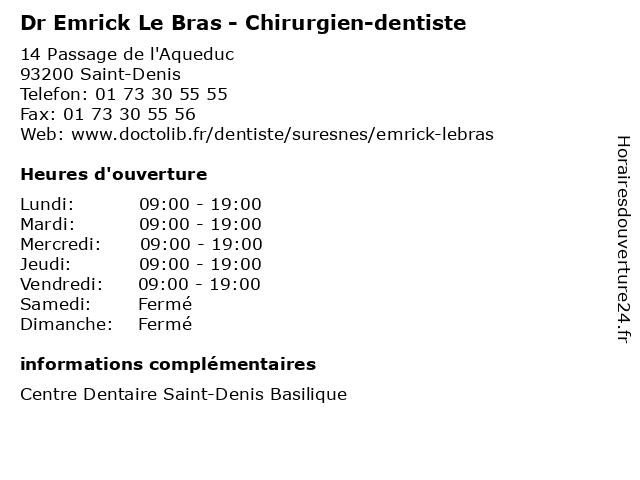 1 Dr Emrick Le Bras - Chirurgien-dentiste (Distance: 10,46 km) 37 Avenue du Président Wilson, 93100 Montreuil bras, chirurgien, consultation, dentiste, docteur, dr, emrick, le, med, médecin, traitement 5 Bras&Co (Distance: 7,11 km) 20 Place De La Republique, 92270 Bois Colombes bar, bistro, bistrot, bras&co, brasserie, café, pub, restaurant, restauration, resto 6 Maître Yann Le Bras - Avocat (Distance: 7,82 km) 5 Place de la République, 75003 Paris avocat, avocats, bras, cabinet, conseils, contentieux, juridique, justice, le, litiges, maître, services, yann |