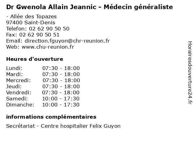 1 Dr Erwan Jeannic - Médecin généraliste (Distance: 3,86 km) - Route des Ananas, 97490 Saint-Denis consultation, docteur, dr, erwan, généraliste, jeannic, med, médecin, traitement 2 Dr Gwenola Prigent - Médecin physique et de réadaptation (Distance: 49,99 km) - Avenue François Mitterrand, 97448 Saint-Pierre chu, cilaos, de, dr, et, forme, gwenola, joseph, la, le, louis, muscle, médecin, physique, pierre, prigent, réadaptation, réunion, saint, sites 3 Dr Sonia Gilormini - Médecin généraliste (Distance: 0,00 km) - Allée des Topazes, 97400 Saint-Denis consultation, docteur, dr, gilormini, généraliste, med, médecin, sonia, traitement 4 Dr Alain Domercq - Médecin généraliste (Distance: 10,42 km) 18 Rue de la Montée des Veuves, 97438 Sainte-Marie alain, domercq, dr, généraliste, médecin 5 Dr Frédéric Louis - Médecin généraliste (Distance: 14,71 km) 14 Avenue de la Palestine, 97419 La Possession docteur, dr, frédéric, généraliste, louis, médecin 6 Dr Gaëtan Dugroprez - Médecin généraliste (Distance: 14,71 km) 14 Avenue de la Palestine, 97419 La Possession dr, dugroprez, gaëtan, généraliste, médecin |